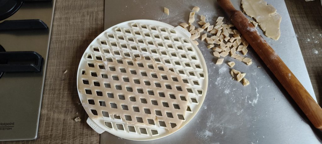 Étalez une partie de la pâte sablée sur une épaisseur d’environ 2 mm et placez-la sur la grille pour tartes en suivant les instructions. Passez au congélateur 3/4 minutes.