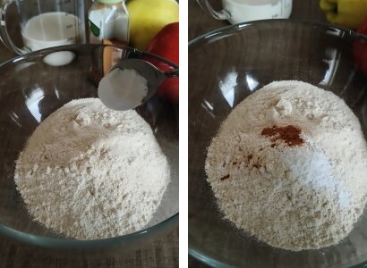 – Commencez par mélanger la farine tamisée, la cuillère à café de levure et une pincée de cannelle et mélangez.