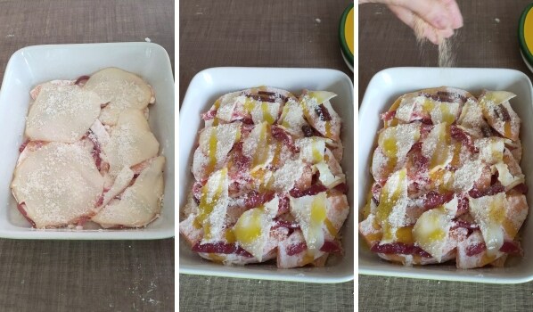 – Saupoudrer de parmesan râpé et continuer à alterner les couches jusqu’à épuisement des ingrédients. Sur la dernière couche, arroser d’huile et saupoudrer également un peu de chapelure et une pincée de poivre.
