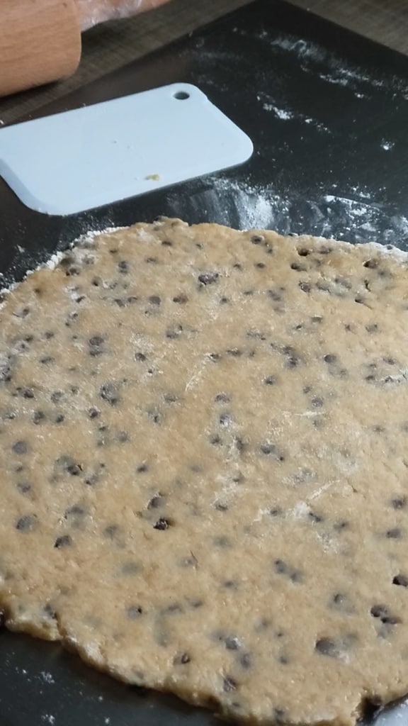 Étalez la pâte brisée avec les pépites de chocolat sur le plan de travail fariné, saupoudrez également la surface et utilisez à votre convenance.