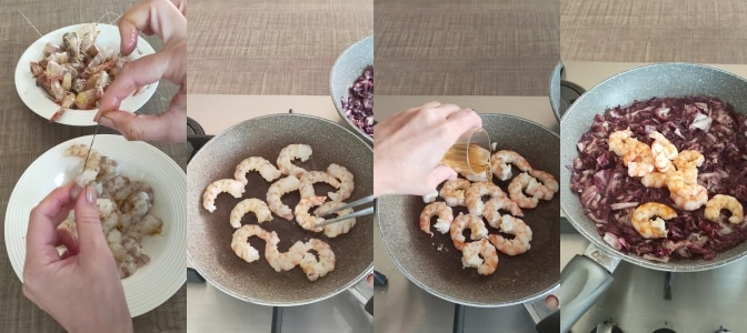 – Chauffer une autre poêle avec peu d’huile et saisir les crevettes des deux côtés puis déglacer avec le brandy ou le cognac. Laisser évaporer l’alcool, éteindre et ajouter les crevettes au radicchio. Cuire encore quelques minutes et éteindre.