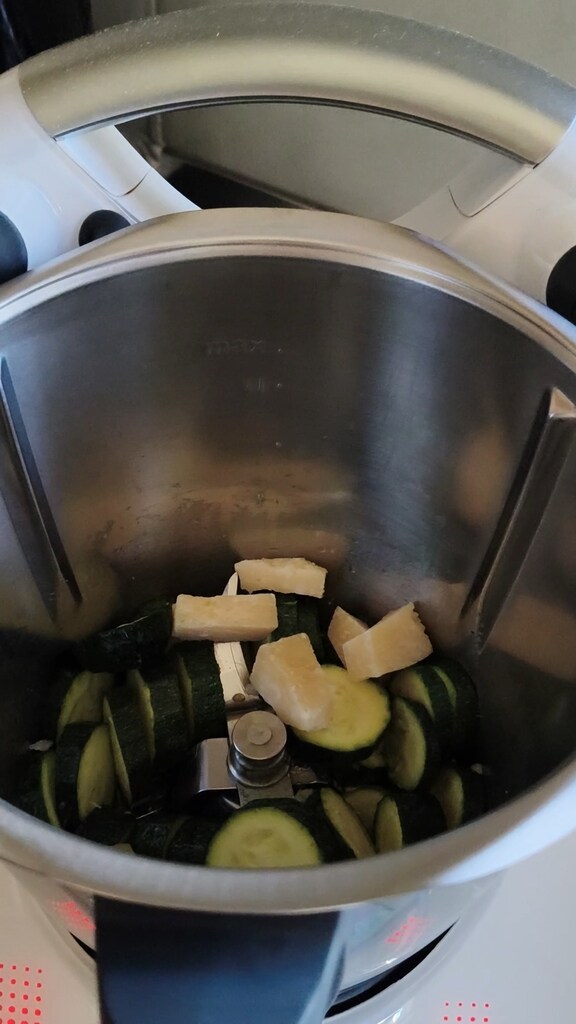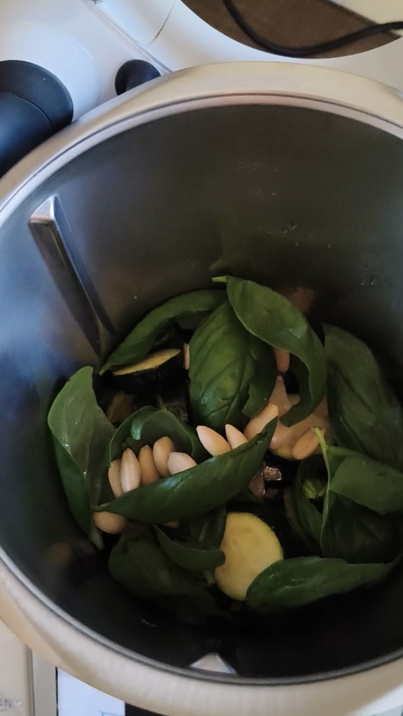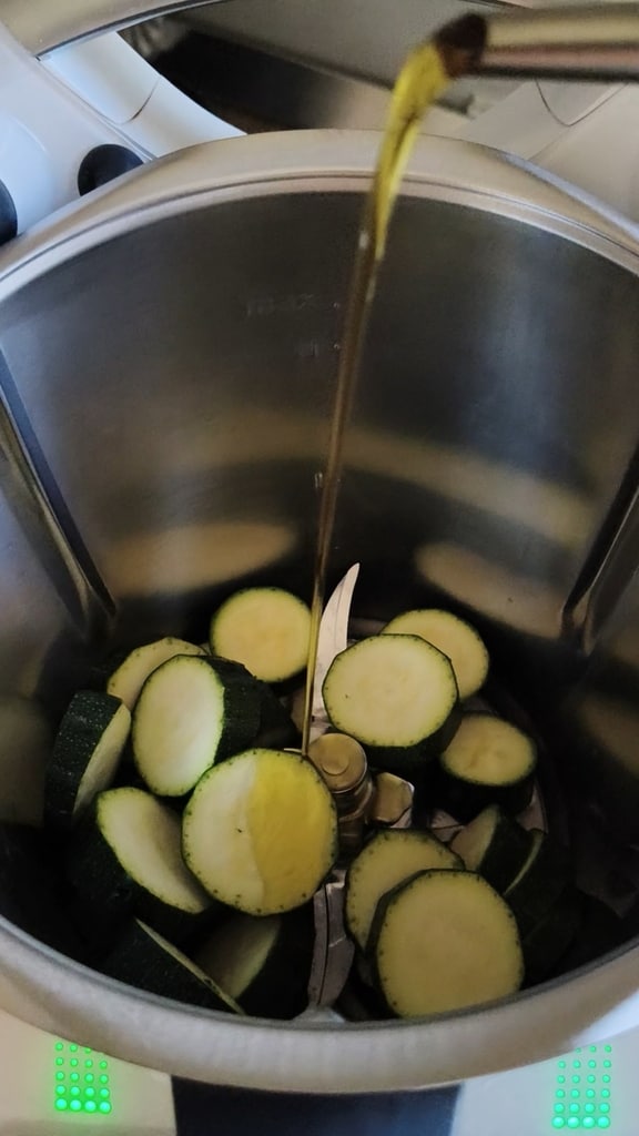En gros, il faut cuire les courgettes pendant quelques minutes avec un peu d’huile et de l’ail, puis tout mixer ensemble. Si vous avez le Thermomix, le procédé est simplifié car tout se fait dans le bol, même la cuisson des courgettes. Mais bien sûr, cela peut aussi se faire sans.