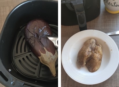 – Cuire l’aubergine, après l’avoir lavée, dans la friteuse à air sans aucun assaisonnement pendant environ 10′ à 180°C. Vérifier en piquant avec une fourchette qu’elle soit cuite et la laisser tiédir pour pouvoir enlever facilement la peau et les graines (s’il y en a).