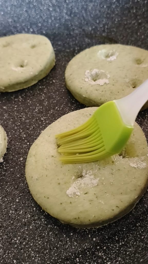 Huiler légèrement la poêle et cuire les focacce environ 2 minutes de chaque côté, en couvrant avec un couvercle.