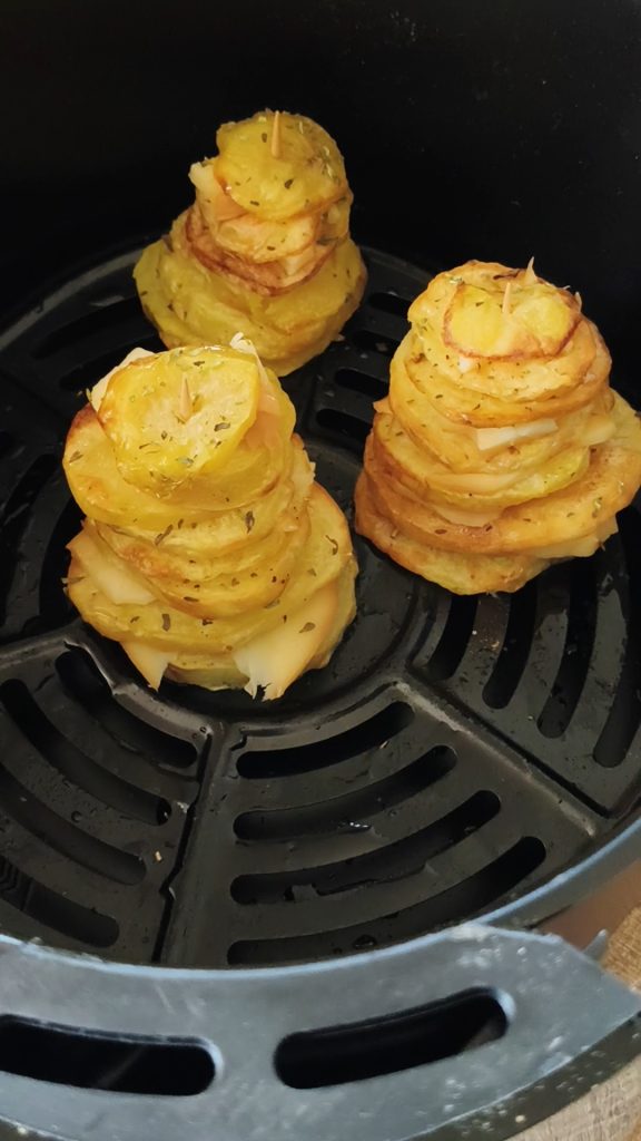 Les pommes de terre sont coupées en fines tranches et passées dans la friteuse à air pour obtenir du croquant, puis assemblées en forme de petit arbre avec des cure-dents. Entre chaque tranche, un peu de scamorza filante lie le tout, tandis qu’une pincée de parmesan et quelques grains de poivre rose complètent le plat avec goût et couleur.
