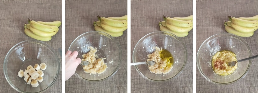 – Éplucher, couper en morceaux et écraser la banane pour la réduire en purée (la banane doit être à point), puis verser l’huile et mélanger. Enfin, ajouter la cannelle en poudre à votre goût.