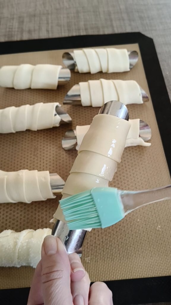 Déroulez la pâte feuilletée et découpez 8 bandes d’environ 2 cm de large. Enroulez chaque bande autour d’un tube sans tirer sur la pâte et en la superposant légèrement. Il n’est pas nécessaire de graisser les tubes.