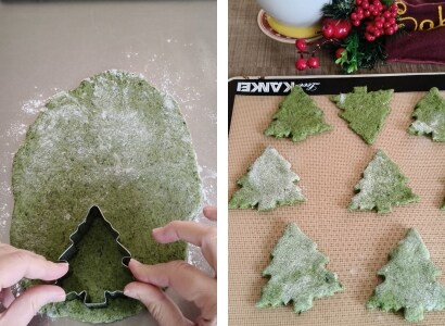 – Étaler la pâte sur une planche légèrement farinée, étaler finement et découper les sapins à l’aide de l’emporte-pièce. Déposer les petits biscuits sur la plaque garnie d’un tapis ou de papier sulfurisé.