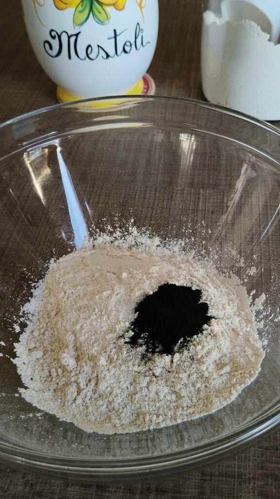 Verser dans un bol les farines, la pincée de sel et l’algue spiruline et mélanger.