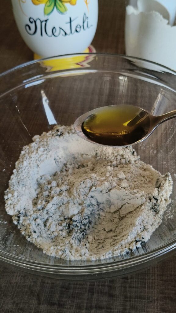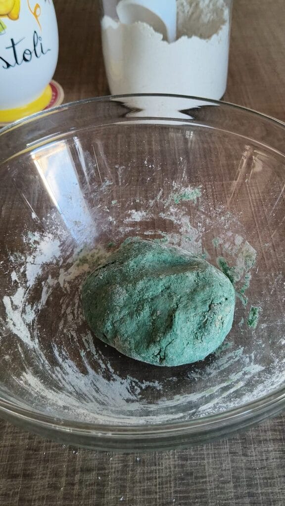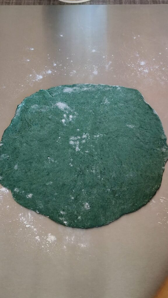 Dans cette version, il n’y a ni levure, ni beurre, ni farines raffinées : seulement de la farine type 1, de la farine d’avoine et une pincée de spiruline en poudre, qui donne à la pâte une couleur verte intense et une note végétale délicate, sans être envahissante.