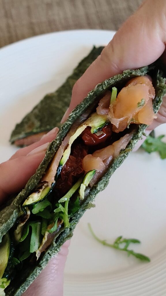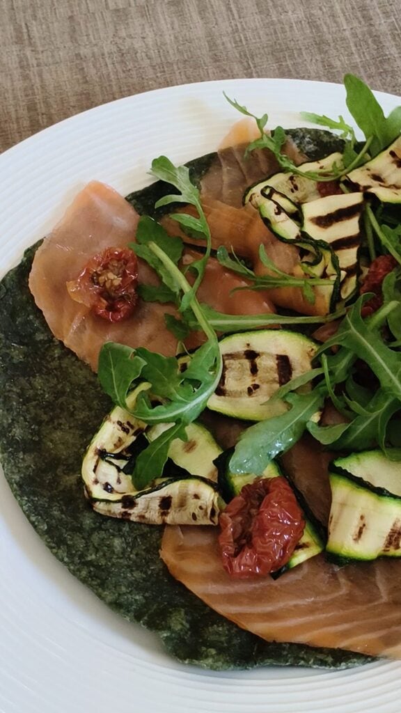 Cette piadina à la spiruline faite maison est idéale pour une pause déjeuner saine, un repas rapide ou à emporter déjà garnie. Moi, je l’ai essayée avec une garniture fraîche et savoureuse : saumon fumé, courgettes grillées, roquette et tomates séchées.