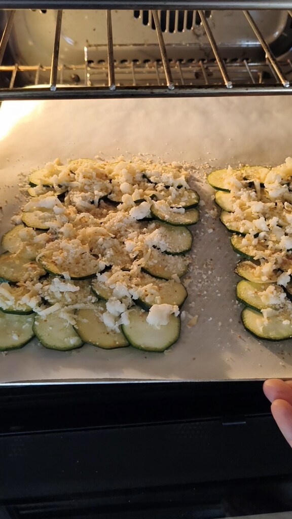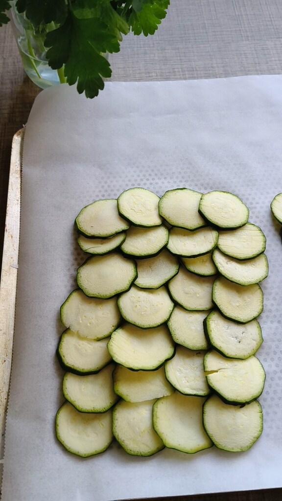 Laver la courgette, la sécher et la parer. La couper en rondelles fines mais pas trop, sinon elles brûlent à la cuisson. Préchauffer le four à 180°C.
