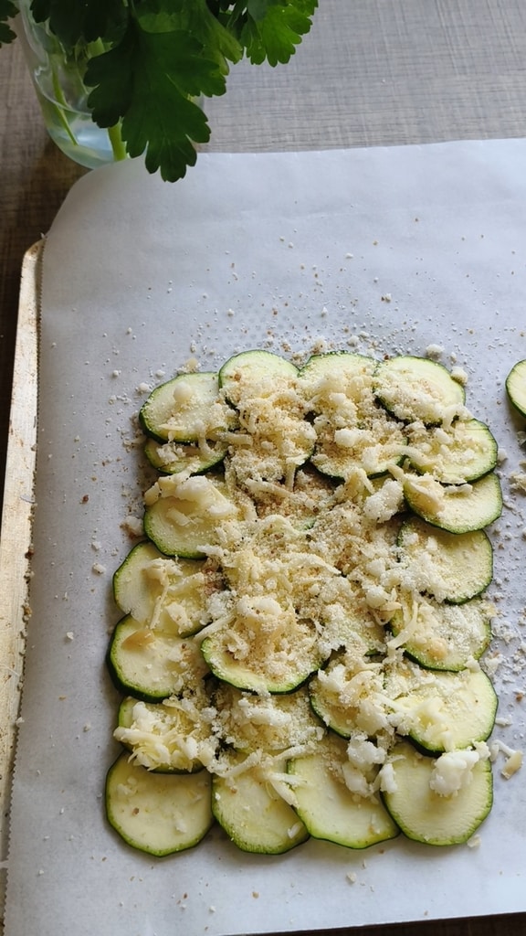 Recouvrir la plaque de papier sulfurisé et disposer les courgettes comme sur la photo. Créer 2 rectangles.