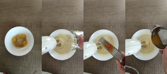 – Verser le sucre et les œufs dans un bol, battre avec un mixeur électrique jusqu’à ce que le mélange devienne mousseux, puis incorporer l’huile, le zeste et le jus d’orange tout en continuant de battre.