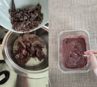 – Placer une casserole avec de l’eau sur le feu et dès que les premières bulles apparaissent, ajouter le chocolat haché. Remuer continuellement avec une cuillère en bois ou une spatule, jusqu’à ce que le chocolat soit complètement fondu et que le glaçage commence à prendre de la consistance. Hors du feu, couvrir avec un film plastique au contact et placer au réfrigérateur. Si préparé la veille c’est mieux, sinon avant de commencer le gâteau, préparez le glaçage pour qu’il ait le temps de s’épaissir au réfrigérateur.