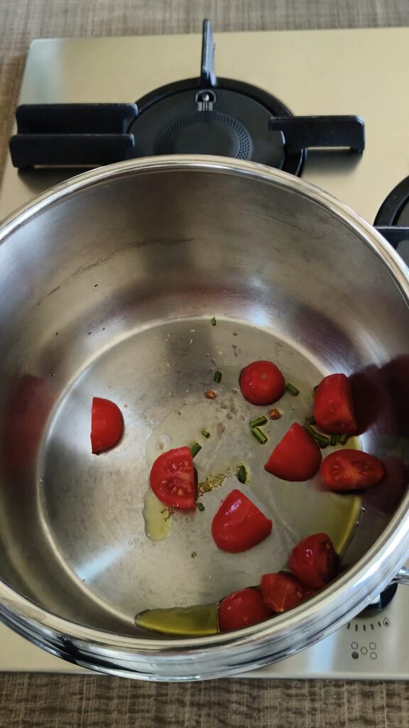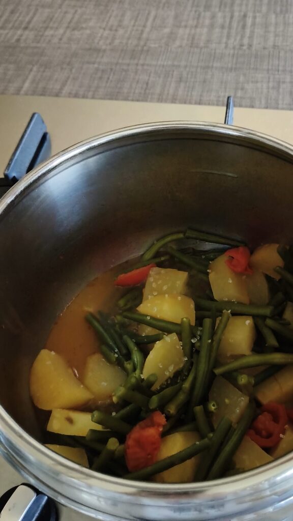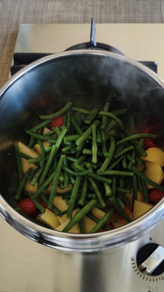 La recette des pommes de terre et haricots verts en cocotte-minute m’a été enseignée par ma maman, maintenant grand-mère, qui utilisait la cocotte-minute quand c’était encore une « nouveauté » en cuisine. Il suffisait de quelques ingrédients, toujours les mêmes : pommes de terre, haricots verts, ail, quelques tomates et un filet d’huile d’olive de qualité. Mais le goût était spécial, et il l’est encore aujourd’hui. La préparer me ramène là, à mon enfance, avec le parfum qui s’échappait du couvercle sifflant.