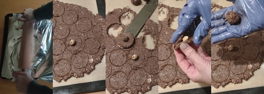 – Avec un emporte-pièce rond ou un petit verre, découper des cercles et mettre au centre une noisette de pâte à tartiner et une noisette. Refermer la pâte sur elle-même et former des boules. Remettre au frigo pendant environ 15′.