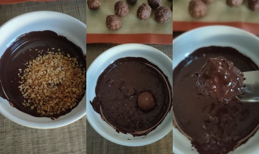 – Plonger les boules dans le chocolat et les laisser sécher au frigo ou à t.a.