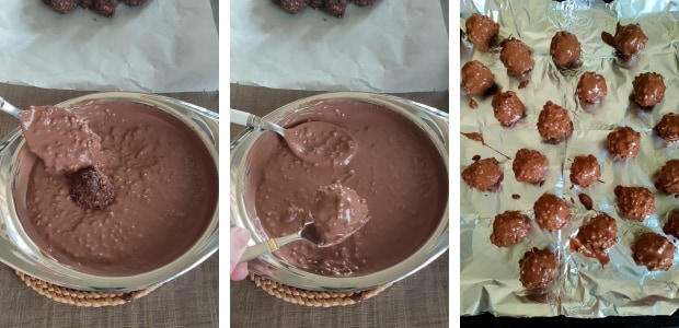 – Tremper une à une les boules froides du frigo dans le chocolat ; les rouler ensuite, égoutter l’excès et les laisser sécher sur la plaque recouverte d’aluminium.