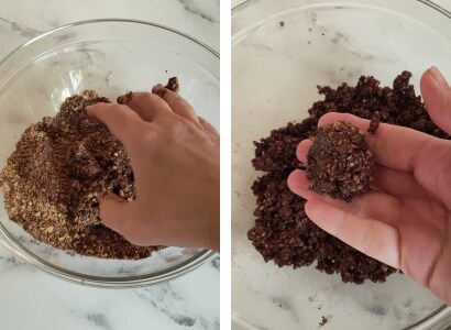 – Mélanger les ingrédients entre eux puis former des boules. Placer les boules sur une plaque recouverte de papier aluminium ou de papier cuisson et mettre au frigo pendant que l’on fait fondre le chocolat pour l’enrobage.