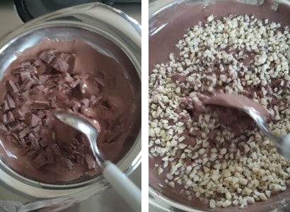 – Hacher au couteau le chocolat au lait et le faire fondre au bain-marie ou au micro-ondes ; laisser tiédir légèrement et ajouter les éclats. Bien mélanger.