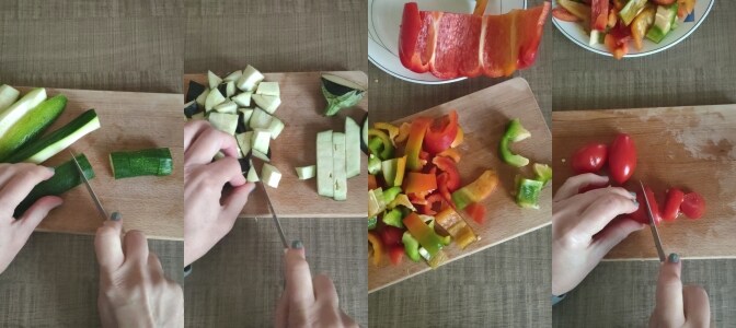 – Lavez les légumes, puis épluchez et coupez en dés de préférence de la même taille les courgettes et les aubergines et en lanières les poivrons.