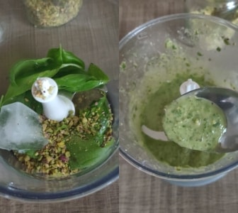 – Entre-temps, préparez avec un mixeur un pesto rapide avec des feuilles de basilic et de persil, une cuillère à soupe de pistaches concassées, un peu d’huile et un cube de glace (pour ne pas oxyder les feuilles avec les lames en mouvement)..