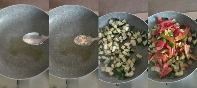 – Faites revenir légèrement dans une grande poêle 3 cuillères à soupe d’huile, ajoutez 1/2 cuillère à café d’ail en poudre et une d’oignon lyophilisé, ou hachez les frais et versez les dés d’aubergines et de courgettes. Couvrez et laissez cuire environ 5′ puis ajoutez les poivrons et poursuivez la cuisson à feu doux environ 15′ en remuant.