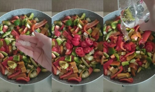 – Salez, ajoutez les tomates coupées en rondelles et un verre d’eau. Couvrez et laissez cuire environ 15′.