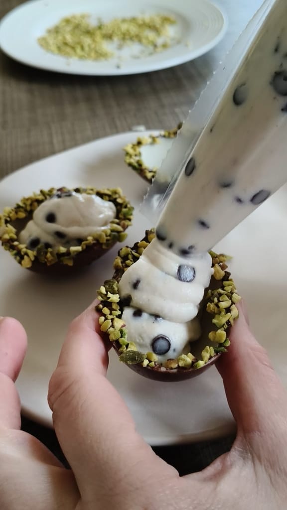 Recette simple : Œufs en chocolat fourrés à la crème de cannoli : petites douceurs rapides et originales sans cuisson.