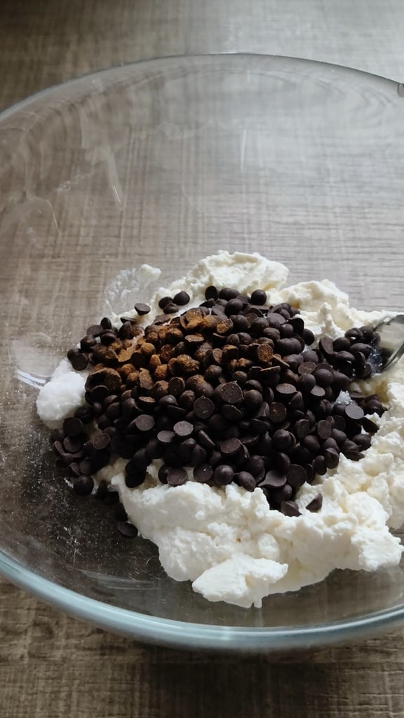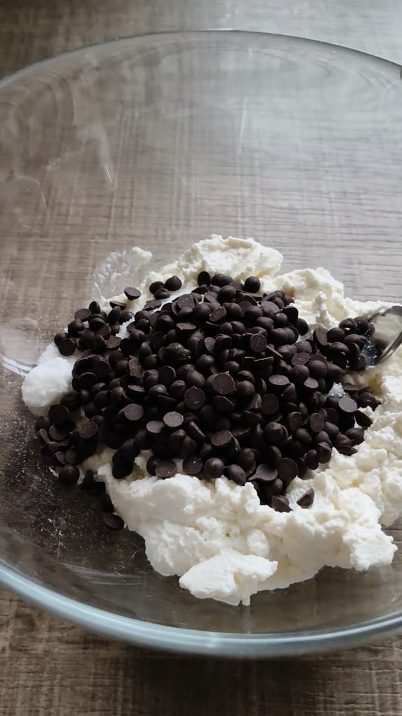 Mettre la ricotta dans un récipient avec le sucre ; écraser bien à la fourchette, puis ajouter les pépites de chocolat.
