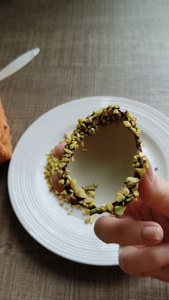 Faire adhérer les éclats de pistaches aux bords des œufs en exerçant une légère pression.