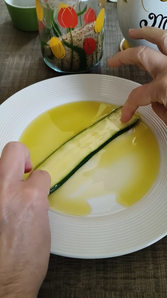 Dans une autre assiette, verser suffisamment d’huile pour passer les tranches de courgettes des deux côtés.