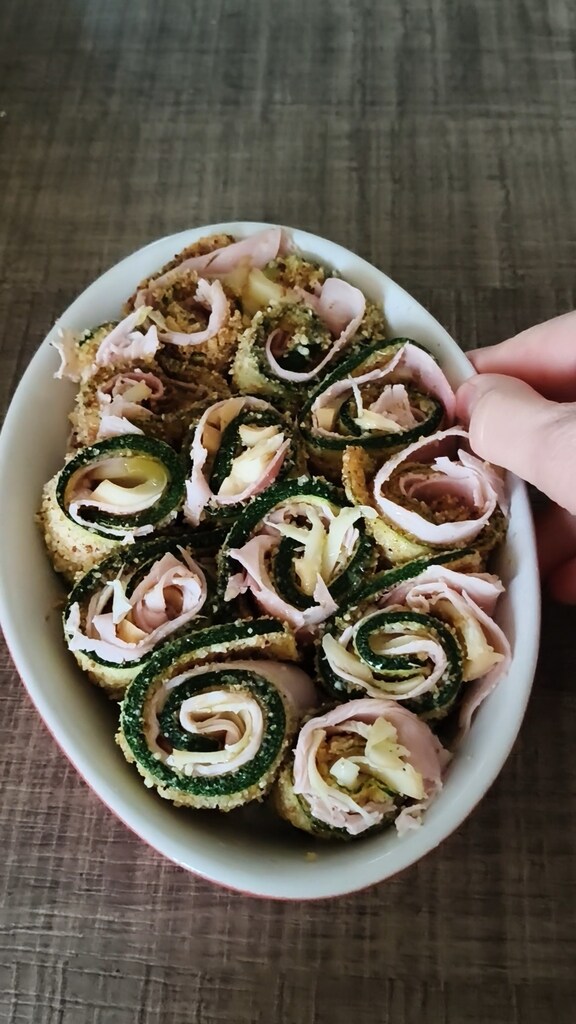 La recette est très simple car il s’agit de farcir les courgettes, d’abord passées dans la chapelure, avec du jambon cuit et de la scamorza, puis de les rouler et de les cuire au four.