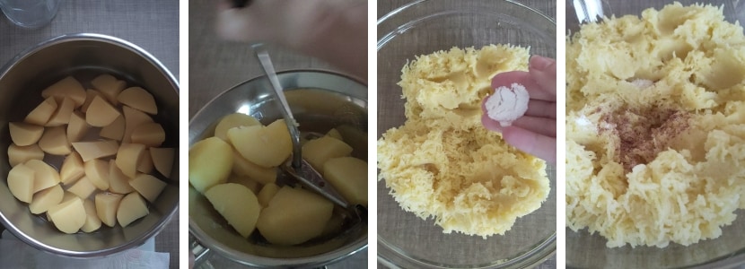 • – Faire cuire les pommes de terre de la manière préférée (je les épluche, les coupe de manière plus ou moins régulière et les fais cuire 4/5′ dans la cocotte-minute avec un verre d’eau à partir du sifflement) et les écraser lorsqu’elles sont encore chaudes.