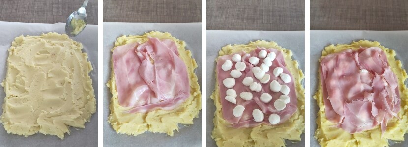 • – Sur une feuille de papier sulfurisé, étaler la pâte en lui donnant une forme rectangulaire, recouvrir d’une première couche de jambon cuit, ajouter les petites mozzarellas et recouvrir avec encore du jambon.