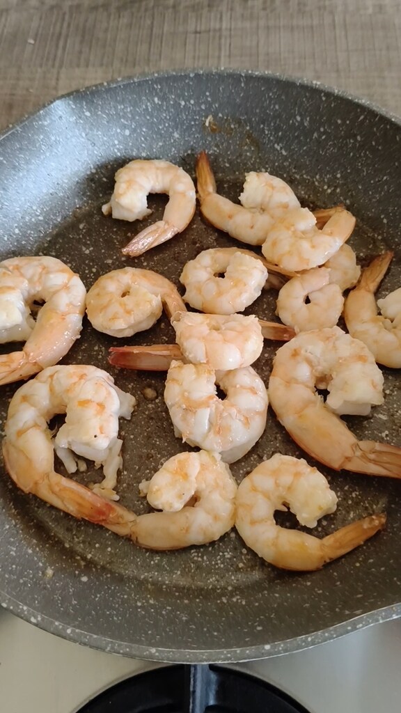 Versez un peu d’huile dans la poêle et faites revenir les crevettes des deux côtés.