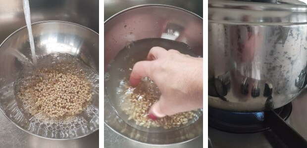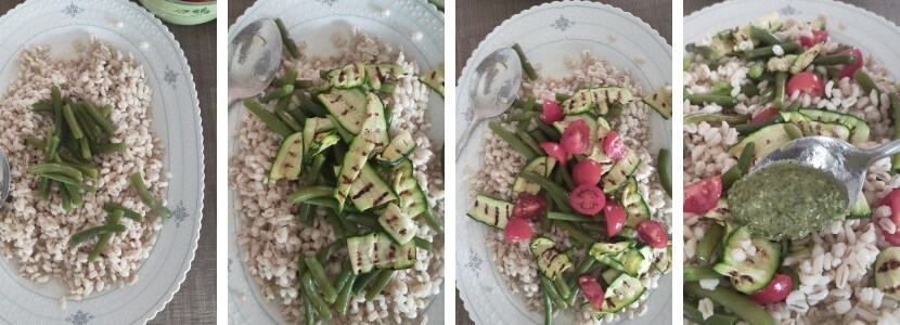 – Rincer l’orge perlé sous l’eau courante puis le cuire en suivant les instructions sur l’emballage; ou bien avec l’autocuiseur pendant 15′ à partir du sifflement. (ajouter une quantité d’eau égale à 2,5 fois) Décompresser l’autocuiseur une fois le temps écoulé et égoutter.