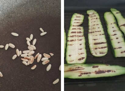 – Faire griller les pignons dans une poêle chaude pour qu’ils soient plus savoureux (mais si vous n’avez pas envie, sautez cette étape) et griller les courgettes