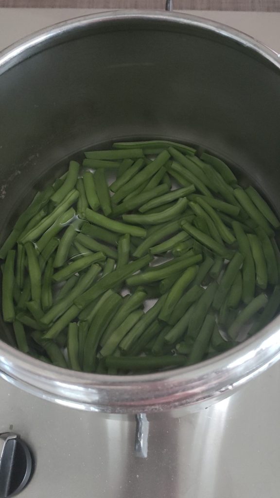 – Dans la même casserole, cuire également les haricots verts avec un verre d’eau après les avoir lavés et parés, pendant 4′ à partir du sifflement. Décompresser à la fin de la cuisson et égoutter.