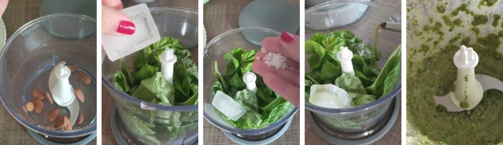 – Rincer les feuilles de basilic et les hacher avec les amandes, l’huile, une pincée de gros sel et un cube de glace (cela évite l’oxydation)