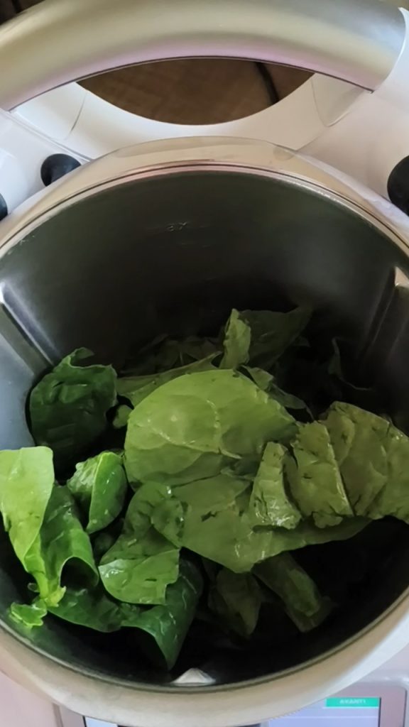 Ajouter les épinards, lavés et cuire 15 min./100°C/ vit.1 sens inverse. Vérifier si c’est bon en sel, mais si le bouillon de légumes est savoureux, ce n’est pas nécessaire. Servir, en assaisonnant avec un filet d’huile, du poivre et du pain grillé.