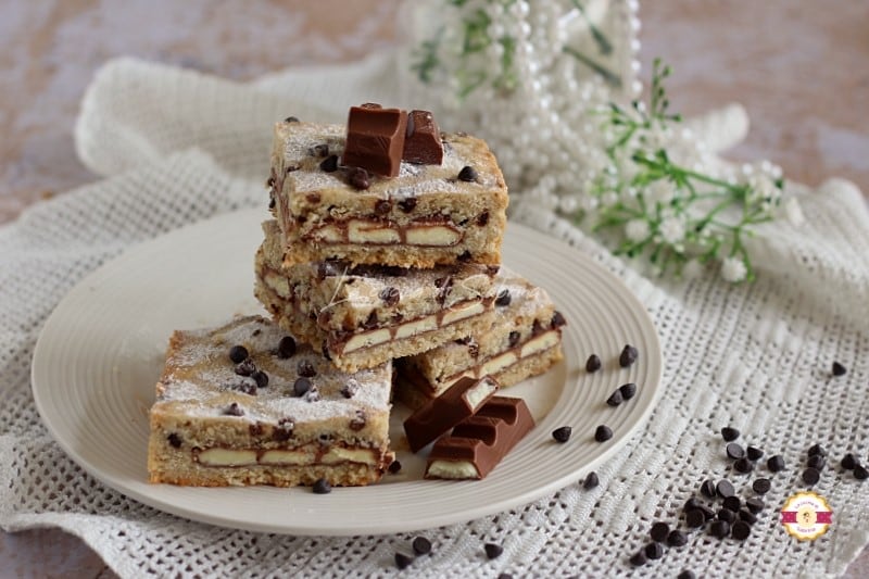 Il s’agit essentiellement de préparer une pâte sablée avec de la levure à l’intérieur, que j’ai choisi d’enrichir avec des pépites de chocolat, et de former la tarte, de préférence carrée, avec à l’intérieur de nombreuses barres de chocolat, toutes alignées côte à côte; couvrir les barres avec une autre pâte sablée et hop au four.