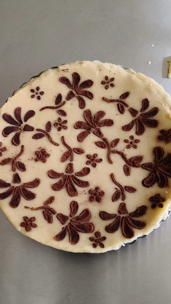 Pour réussir parfaitement la tarte, il est fondamental de commencer par une excellente base, c’est-à-dire la pâte sablée, puis d’utiliser les pochoirs appropriés que l’on trouve en ligne ou dans les magasins de pâtisserie bien approvisionnés.