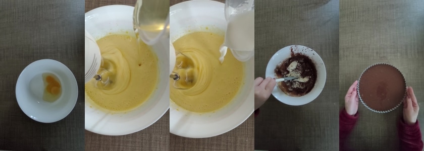 – La procédure est la même que pour la tarte happiness. Battez les œufs avec le sucre, versez l’huile et le lait et enfin les poudres préalablement tamisées et mélangées entre elles. Remplissez le moule légèrement huilé avec le mélange puis cuisez au four chaud à 180°C pendant environ 25 minutes.