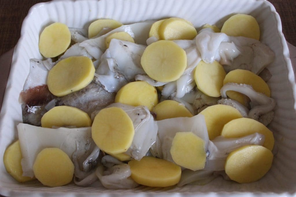 • – Trancher les pommes de terre et les alterner, dans la plaque légèrement huilée, avec les seiches nettoyées et coupées en morceaux réguliers.