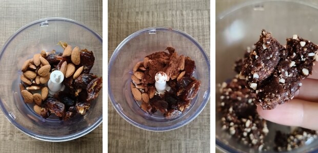 – Mettre dans le verre du mixeur les dattes d’abord coupées en morceaux (ainsi les lames ne s’abîment pas), les amandes et le cacao et mixer jusqu’à obtenir une pâte compacte et peu collante.
