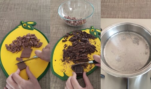 Hacher au couteau les deux types de chocolat et mettre de côté.