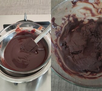 – Verser les deux chocolats, la crème et le beurre mou dans un même bol et dès que l’eau sur le feu atteint l’ébullition, mettre le bol dedans (attention à ne pas laisser tomber de gouttes d’eau) et faire fondre le beurre et les chocolats.