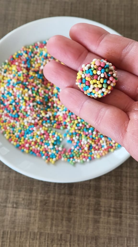 Former des boules de la taille d’une noisette et les rouler dans les vermicelles colorés. Mettre chaque truffe dans une caissette et conserver au réfrigérateur.